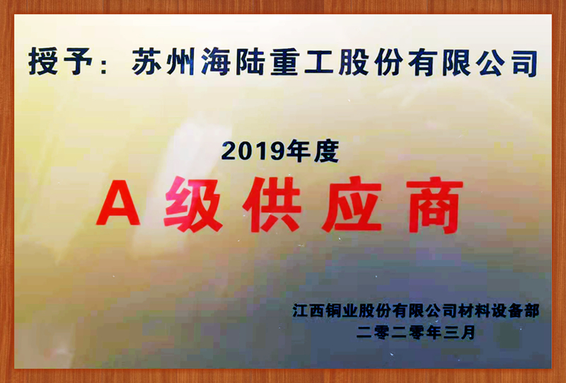 2020年11月30日,在江銅集團召開的“A級供應商授牌大會”上,蘇州海陸重工股份有限公司從近千家供應商中脫穎而出,入圍48家A級供應商名單,獲得“2019年度A級供應商”榮譽稱號。公司董事長兼總經理徐元生、副總經理陳吉強受邀參加本次會議。